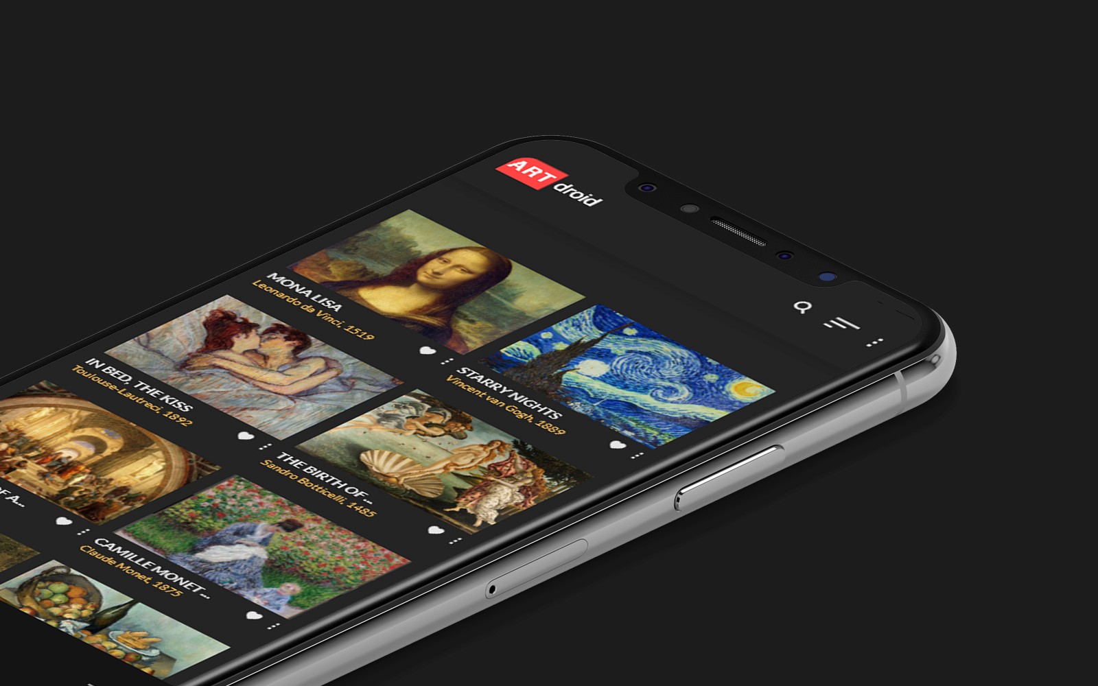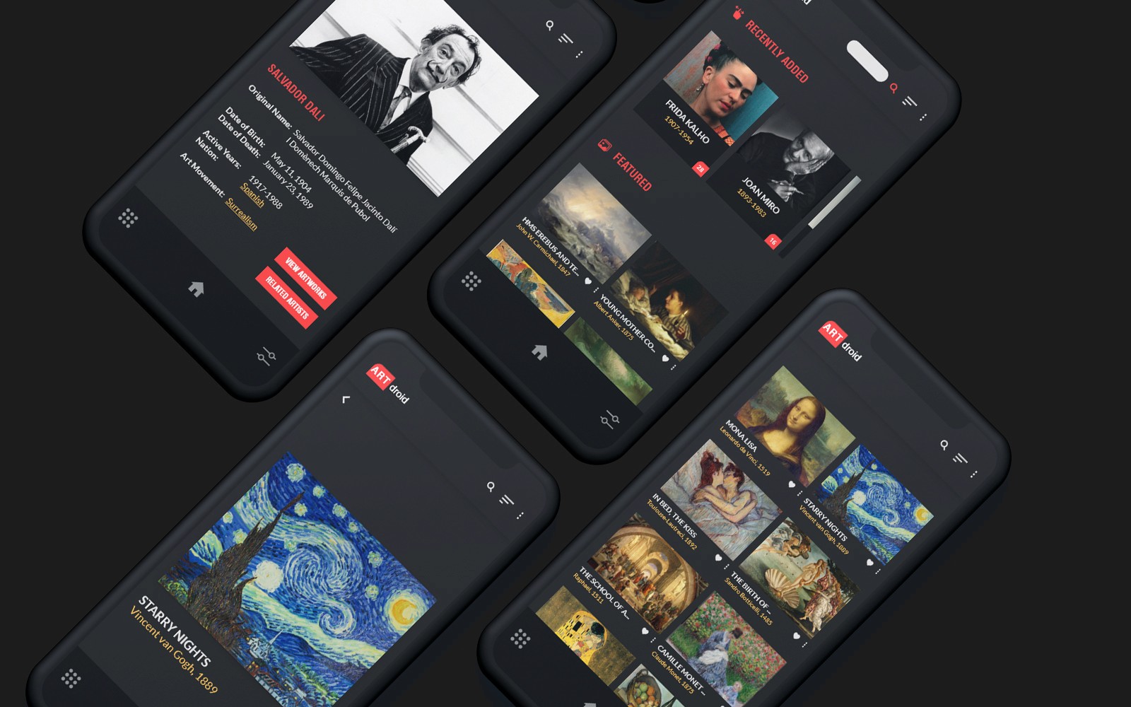 Art-Droid is a mobile app that reimagines the user experience of Wikiart.org, the visual art encyclopedia. In this self-initiated project, I rebranded and redesigned the UX/UI to create a modern, minimal, and stylish aesthetic. The primary goal was to craft an immersive experience that highlights and celebrates the beauty of the artworks themselves.